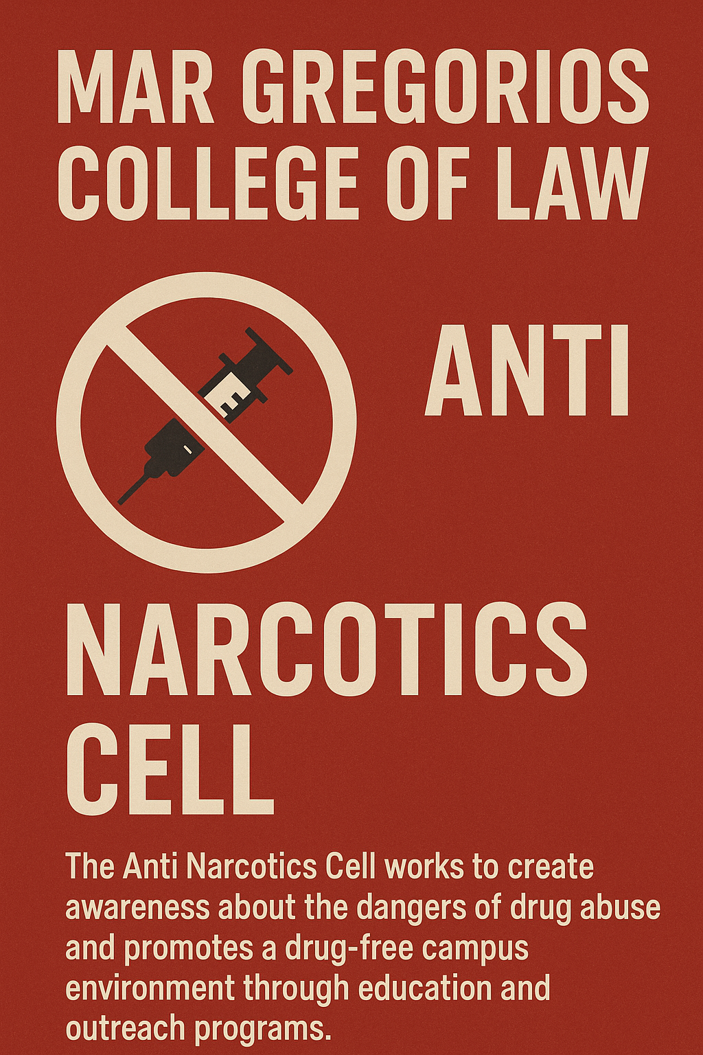 The Anti Narcotics Cell of Mar Gregorios College of Law functions with the objective of fostering a drug-free campus and creating awareness among students about the harmful effects of substance abuse. The Cell operates under the guidelines of the Higher Education Department and coordinates with the College Counselling Cell, NSS Unit, and external experts as needed. The Cell remains committed to preventive education, continuous monitoring, and student welfare.